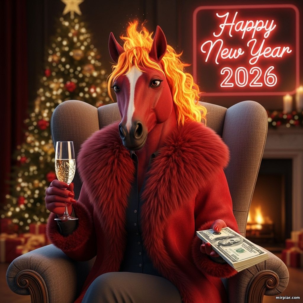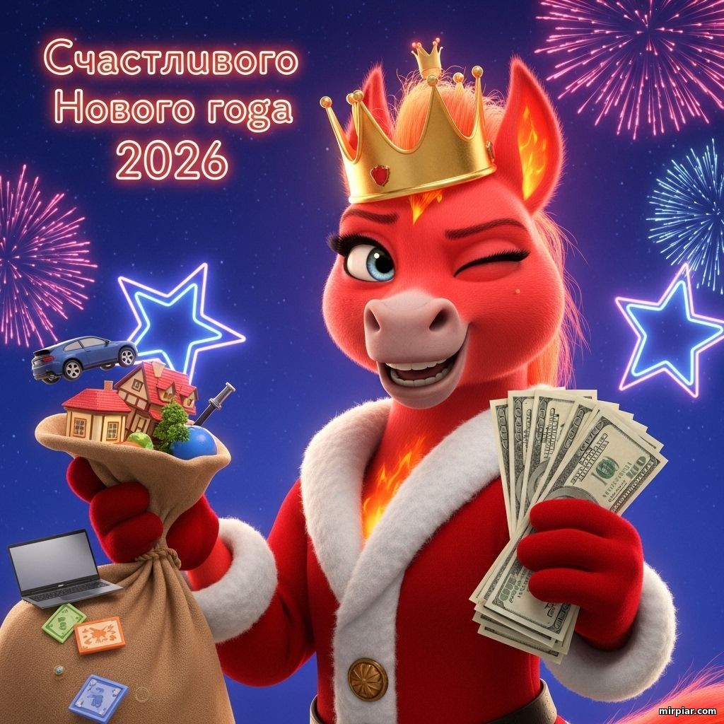 Новогодняя открытка 2026: Огненная лошадь дарит деньги